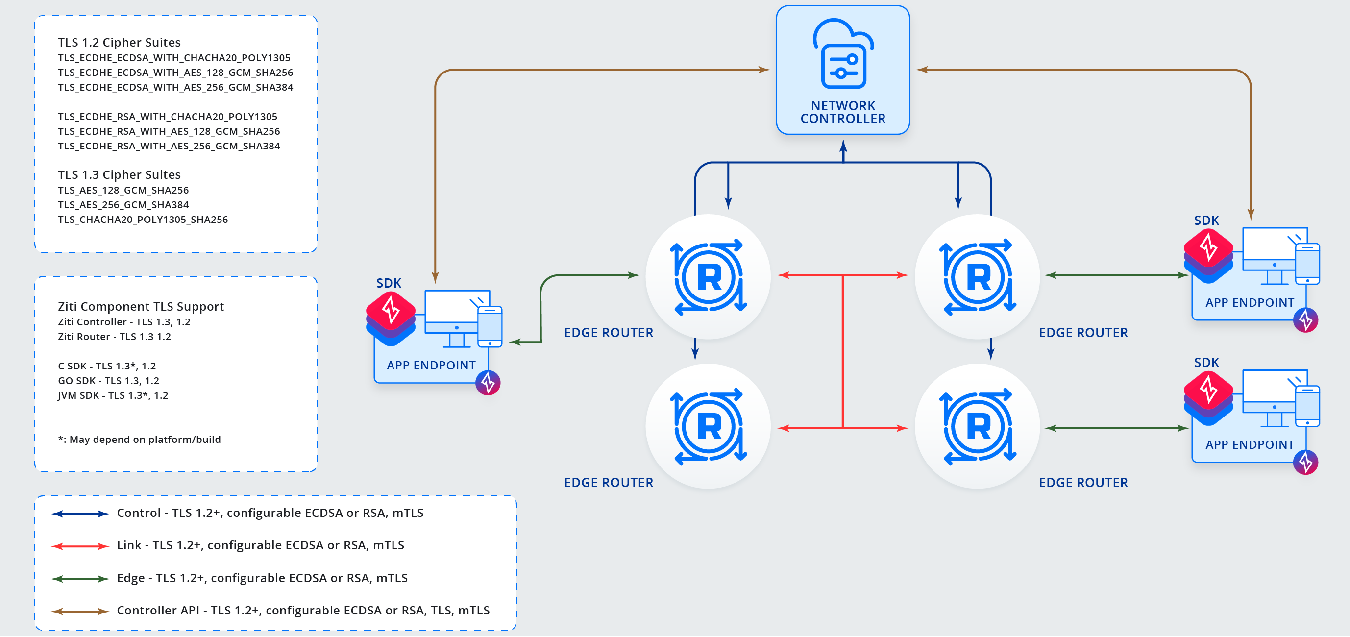 Ziti networks use robust modern cryptography and security mechanisms. Each component within a Ziti network uses security technology that fits its role and use-cases.
